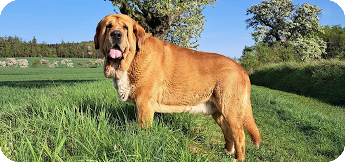 Características físicas: Tiene una cabeza ancha y poderosa, con orejas caídas y ojos pequeños que transmiten una expresión amable y alerta. Su cuerpo es macizo, con un pecho amplio y extremidades fuertes.